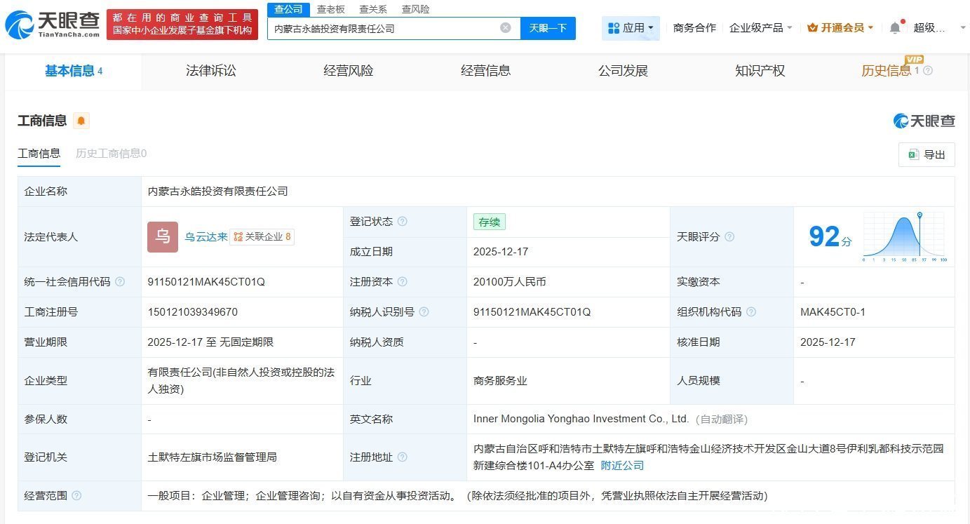 天眼查工商信息显示盛鹏优配,近日,内蒙古永皓投资有限责任公司、内蒙古泰威投资有限责任公司、内蒙古鸿腾投资有限责任公司、内蒙古裕超投资有限责任公司、内蒙古隆卓投资有限责任公司成立,法定代表人均为乌云达来,注册资本分别为2.01亿人民币、1.74亿人民币、1.5亿人民币、1.22亿人民币、2900万人民币,经营范围为企业管理、企业管理咨询、以自有资金从事投资活动。股东信息显示,上述公司均由伊利股份(600887)全资持股。
