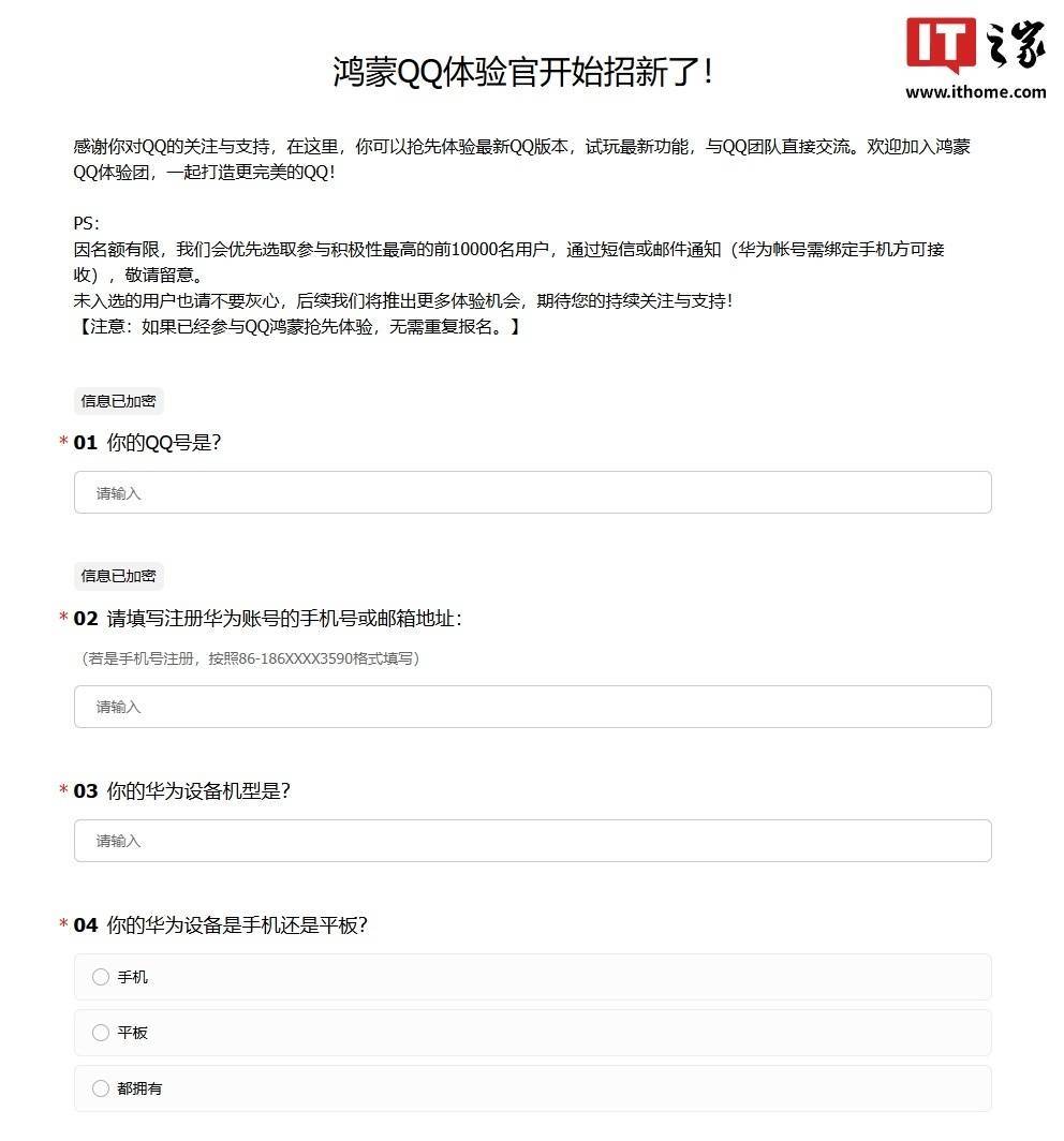 值得一提的是,本月早些时候,QQ 鸿蒙版 App 官宣体验官招新,已开启新一轮邀测报名。据介绍,活动名额有限,会优先选取参与积极性最高的前 10000 名用户,通过短信或邮件通知(华为账号需绑定手机方可接收)。